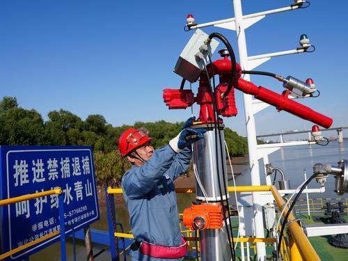 近日,南化公司完成11号码头趸船消防系统智能化升级改造。新增消防炮塔、自动灭火装置等设备,将原有手动消防炮升级为智能系统,构建现代化消防体系,提升应急响应效率,筑牢“技防+人防”安全屏障。图为码头岗位人员检查智能化消防系统。裴 昱 摄