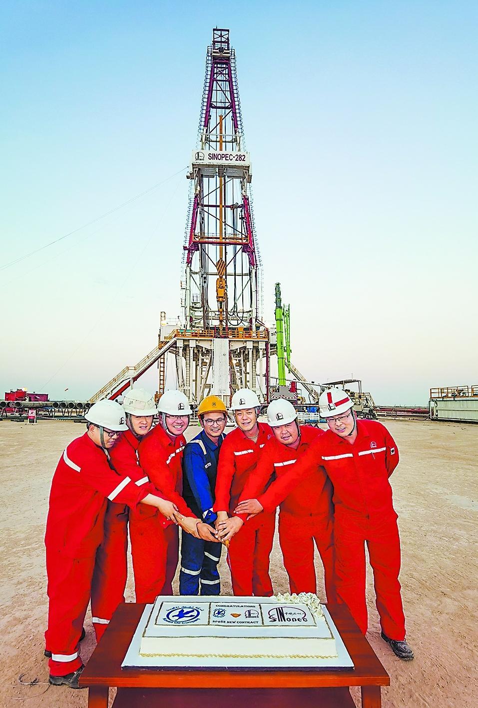 石油工程公司在江苏油田花页4-1HF井施工现场。西南石油工程科威特项目SP282井队庆祝顺利开钻。