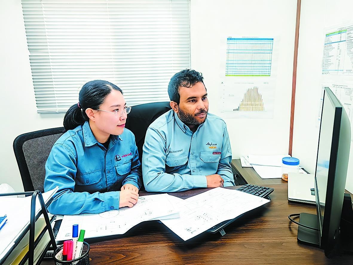 图为刘巧钰(左)与沙比克公司项目首席工程师库米讨论工艺流程。 陈 飞 摄●李 舒