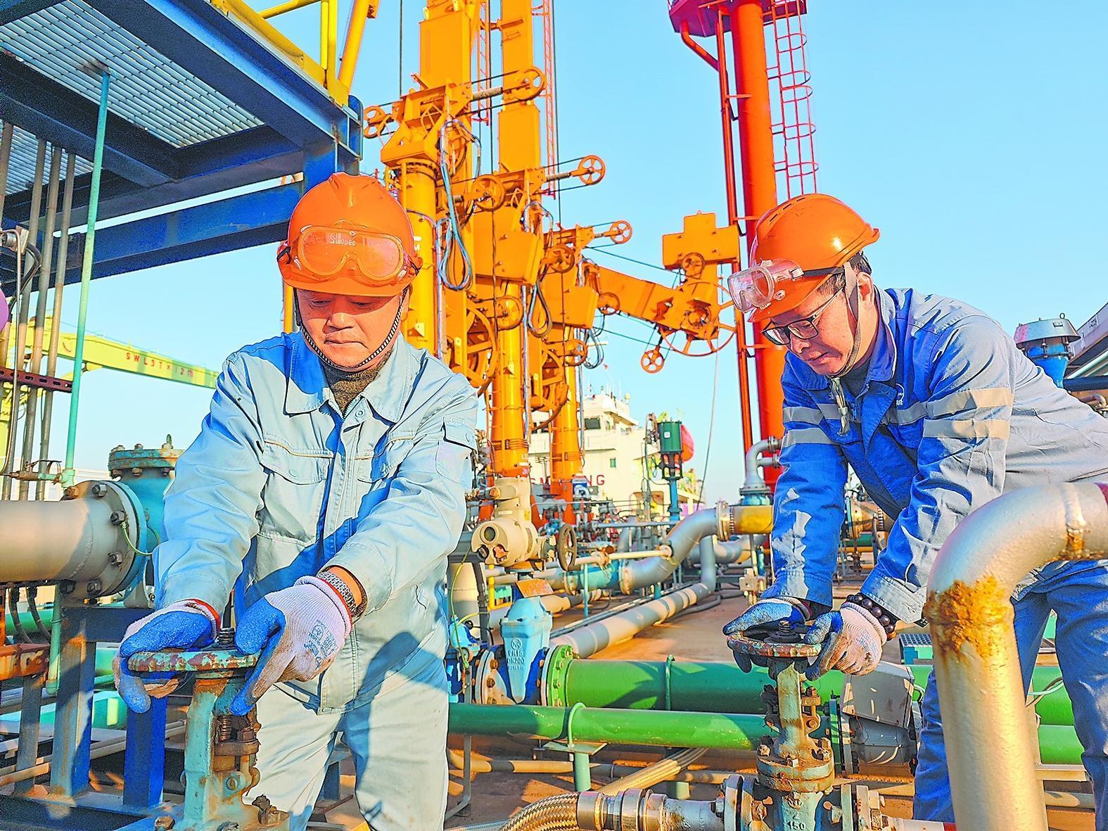 春节期间,镇海炼化一线员工坚守岗位保供应,严格设备巡检,严细工艺操作,确保油品安稳保供不停歇,日生产汽柴煤油近4万吨。图为2月20日正月初四,镇海炼化算山码头泊位工在航煤装船后回收输油臂内余油。